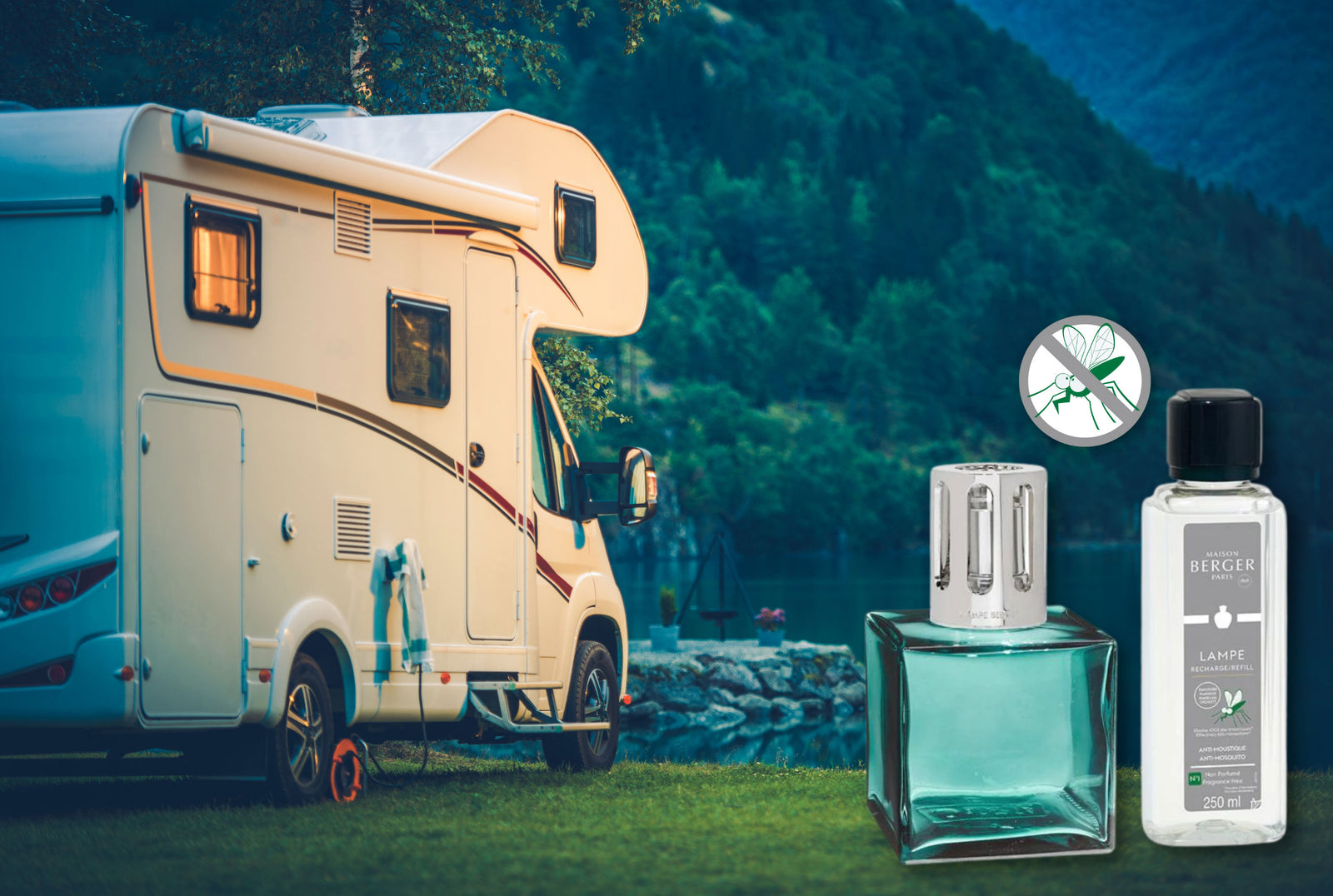 Verwenden Sie unsere Lampe Berger mit der speziellen Anti Mückenflüssigkeit für 30 Minuten im Innenraum Ihres Campers oder Wohnwagens und sie tötet 100% aller Mücken im Innenraum ab und hält den Innenraum für 8 Stunden mückenfrei.
